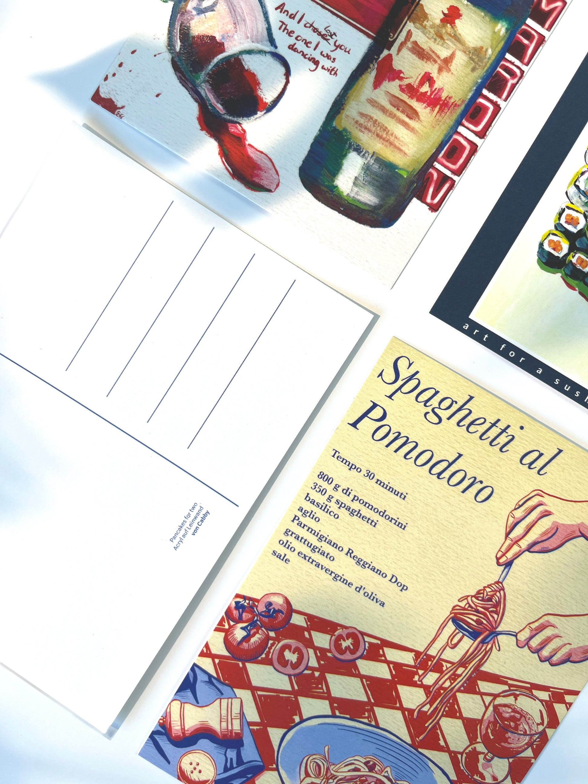 Dieses Postkarten-Set beinhaltet die Motive Maroon (Wein), Just a taste (Sushi), Pancakes for two und Spaghetti al Pomodoro.