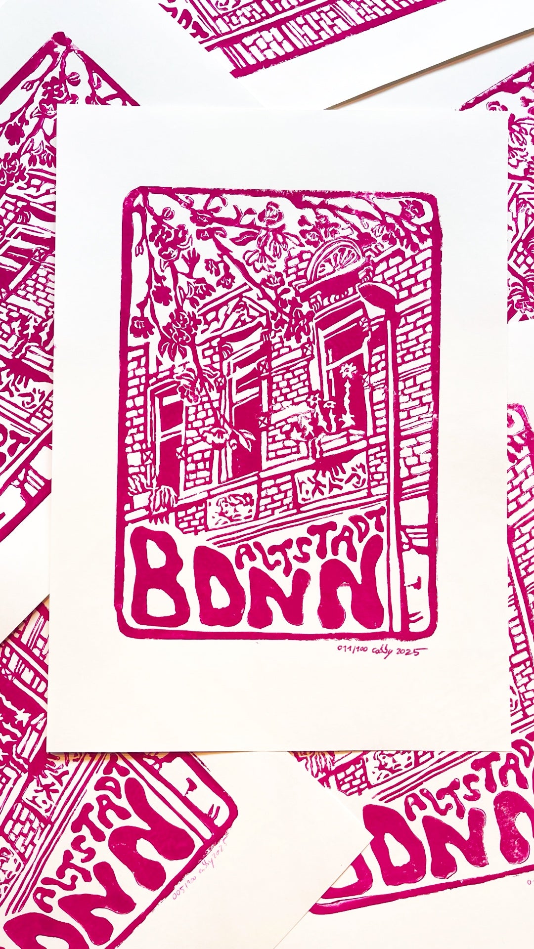 Diesen Linoldruck habe ich selbst kreiert und auf DIN A3 Papier (ca. 200g) gedruckt. Alle Drucke sind auf 100 Stück begrenzt und haben eine individuelle Nummer.