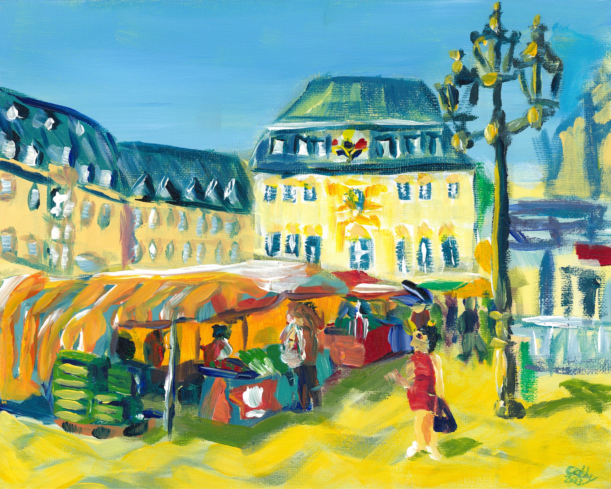 Dieses Kunstwerk habe ich 2023 mit Acryl auf ca. 22cm x 30cm auf Malkarton gemalt. Es zeigt den Bonner Marktplatz in sommerlichen expressiven Farben.